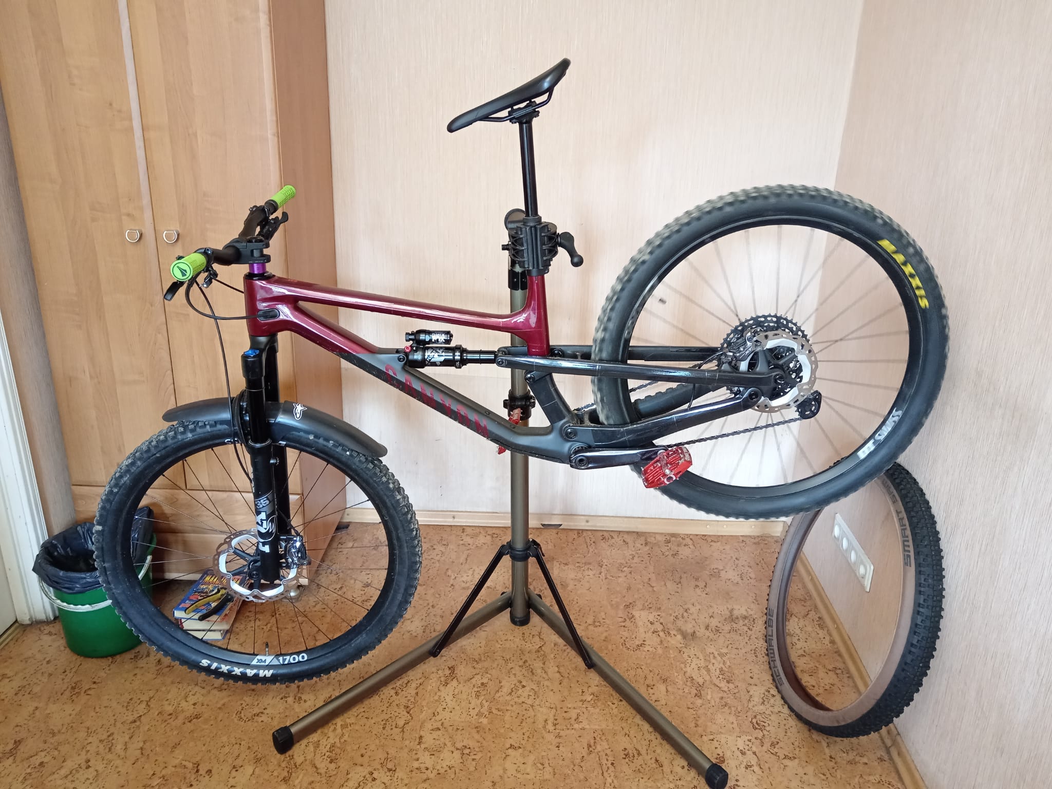 Piekare. Priekšā fox 36 grip2, aizmugurē fox float x ar compression tuning. Apkope tika veikta martā 2026.